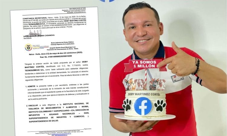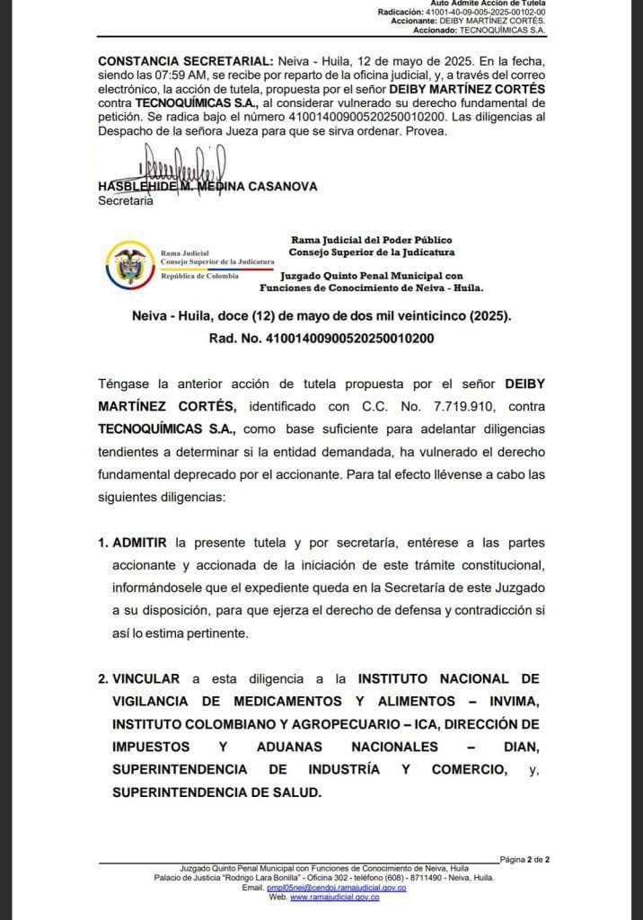 El Juzgado Quinto Penal Municipal con funciones de conocimiento de Neiva admitió la primera acción de tutela en Colombia contra la empresa Tecnoquímicas S.A., interpuesta por el activista animalista Deiby Martínez Cortés, por presunta vulneración al derecho fundamental de petición.
